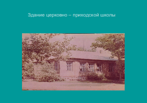 Здание церковно-приходской школы в нашем селе сохранилось до настоящего времени. Это нынешнее здание рядом с ДК. Построено оно добротно, из рубленых брёвен, обмазано глиной. Состояла школа из пяти классных комнат (одна из них именовалась залой, где проходили праздники, хоровое пение), а также канцелярии. Один класс отводился под жильё для учителей (при необходимости). В школе были высокие потолки, светлые окна. Оборудование в церковно-приходской школе было нехитрым: доска и мел у учителя, грифельные доски у учеников, чтобы писать, а затем стирать написанное после проверки. Учебный год длился с Покрова (14 октября) до Егория (6 мая), так как дети много помогали дома по хозяйству. На каникулы отводилось время Святок и три дня Пасхи.